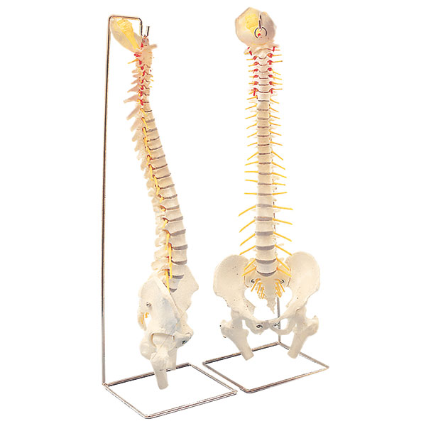 Wirbelsäule mit Becken, Hinterhauptschuppe, Nervenenden, Arteria vertebralis und dorsolateralem Bandscheibenvorfall zwischen dem 3. und 4. Lendenwirbel.