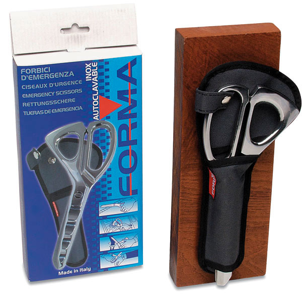 Diese Schere ist ein Multifunktionstalent: Sie ist ideal zum Durchtrennen des Rettungsgurtes, als Kleiderschere (Aufschneiden der Kleidung des Verletzten), aber auch durch die besonders massiven Ringe (Solinger Stahl) zum Einschlagen von Autoglasscheiben geeignet. Die massive Schere wird in einer Spezialhalterung, die mit Spreizfedern leicht montiert werden kann, geliefert. Einfach in Griffnähe montieren, Schere in Halterung einklemmen.