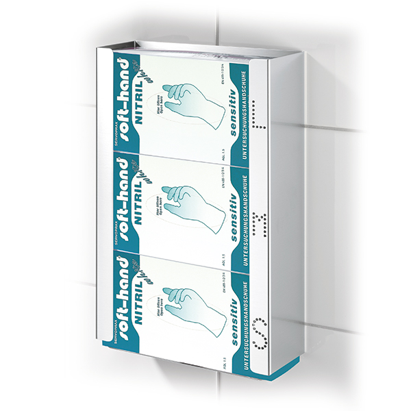 So unterschiedlich wie Hände sind, so klar konzipiert sollte die Lösung zur Entnahme der einzelnen Handschuhgrößen sein. Der Triple bietet eine einfache Bestückung mit Spenderkartons der Größen S, M und L. Durch das Schlüsselloch-System ist er schnell und ohne Werkzeug von der Wand zu entfernen und wieder anzubringen.