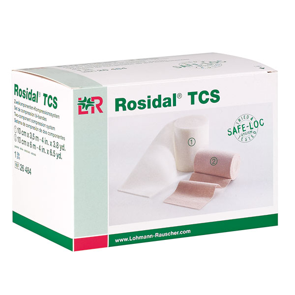 Zweikomponenten-Kompressionssystem Rosidal TCS. Dabei handelt es sich um die Kombination zweier Produkte zu einem sicheren System: Die innovative polsternde Kompressionsbinde Rosidal SC (Soft Compression) mit integriertem textilen Hautschutz gepaart mit der kohäsiven Kurzzug-Kompressionsbinde Rosidal CC (Cohesive Compression). Die Lösung überzeugt durch Anwender- sowie Patientenfreundlichkeit. Denn sie ist dank Safe-Loc ein unter vollem Zug einfach anzulegendes System, das angenehm zu tragen ist. Insbesondere in der Nacht ist der niedrige Ruhedruck ein klares Plus für die Compliance. Die Rosidal TCS System-Komponenten sind frei von Naturkautschuklatex und somit eine gute Alternative für Menschen mit einer Latexüberempfindlichkeit.